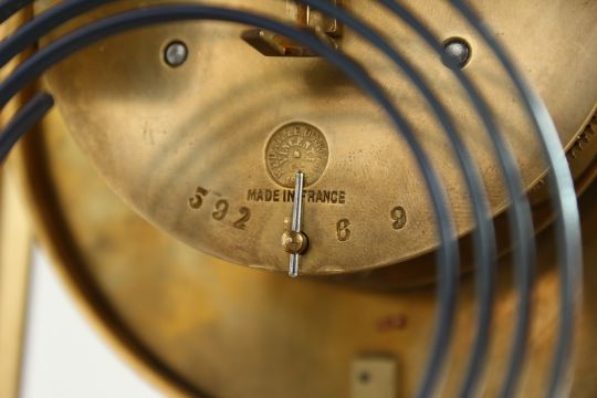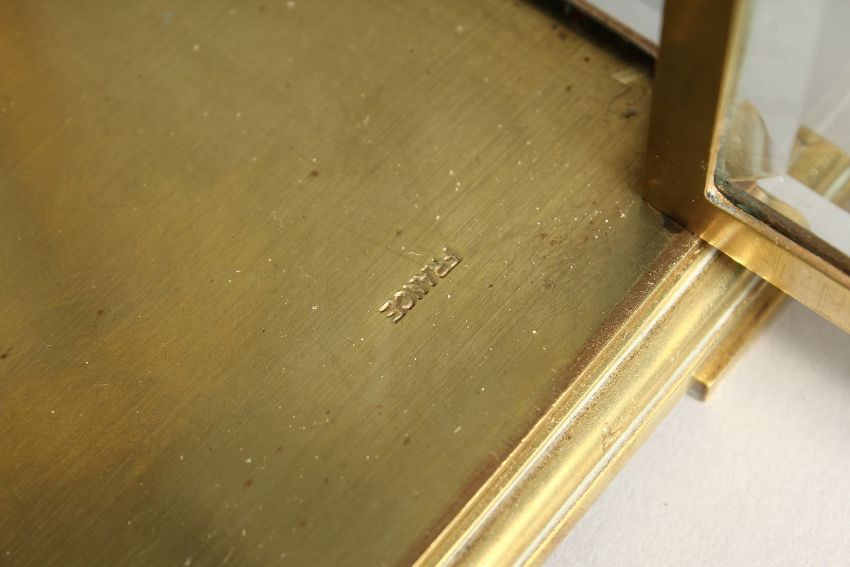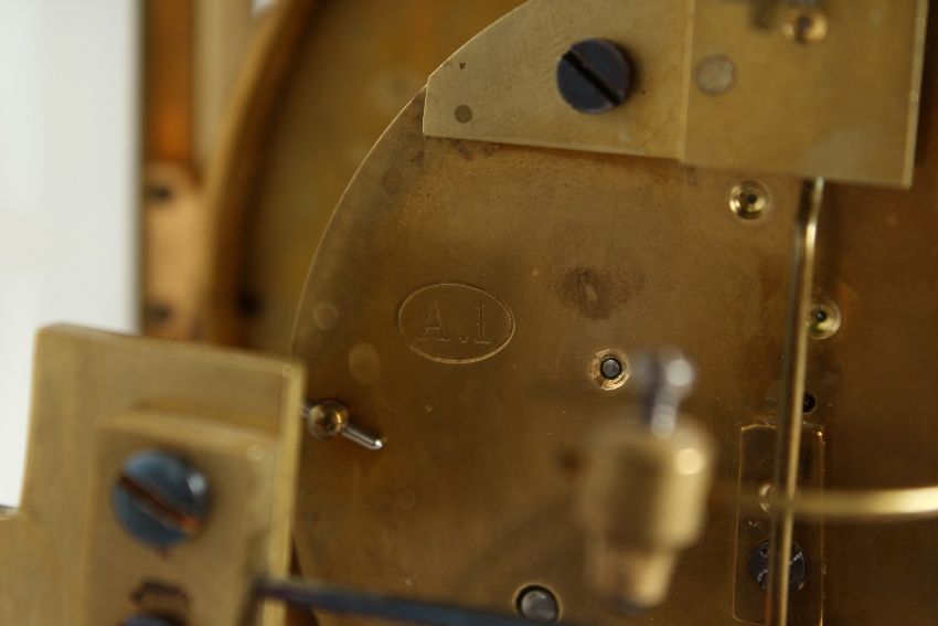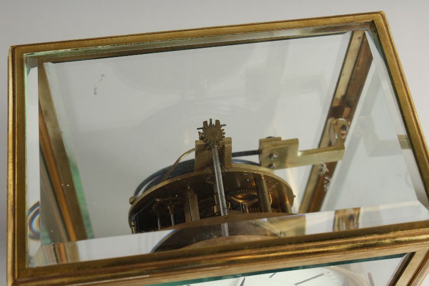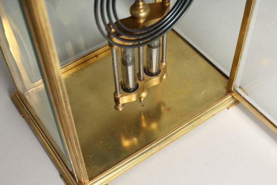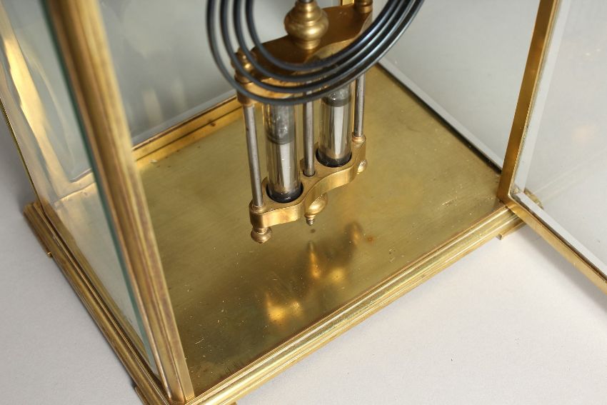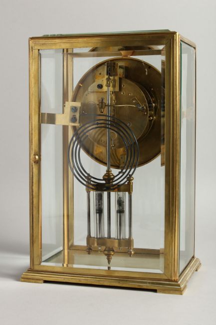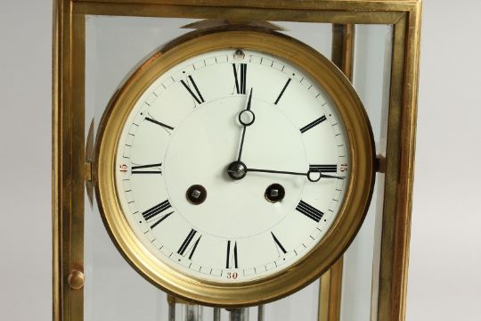 A GOOD BRASS FOUR GLASS CLOCK with white dial and pendulum.