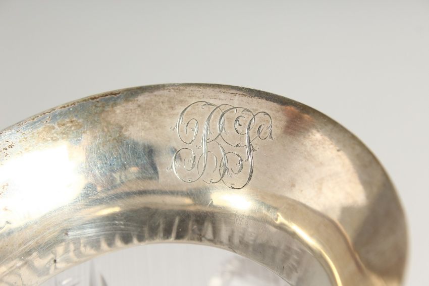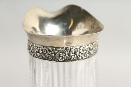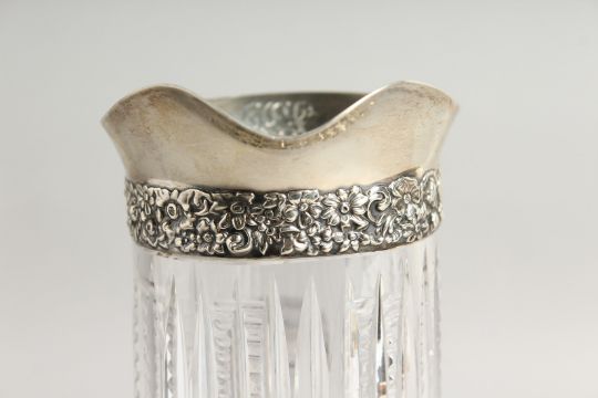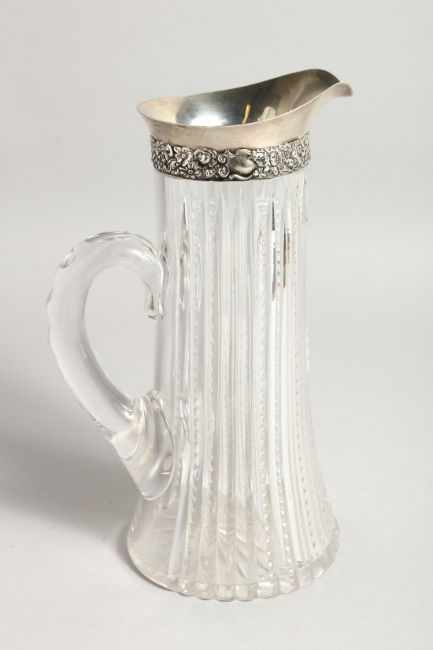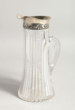 A SILVER MOUNTED GLASS JUG.