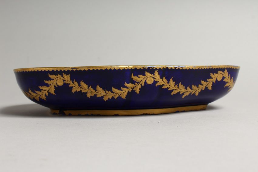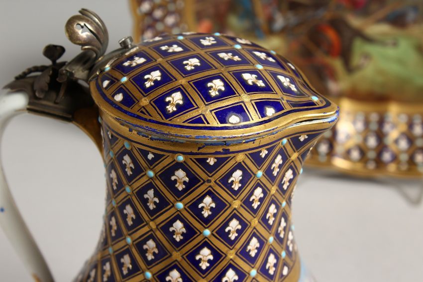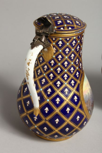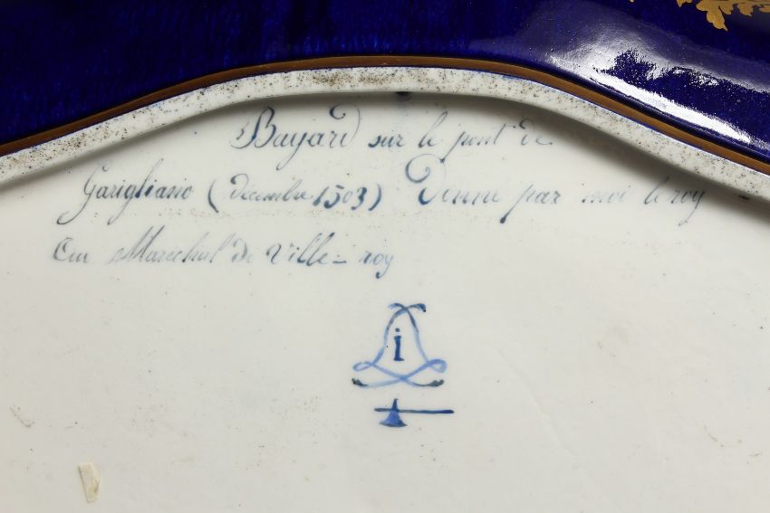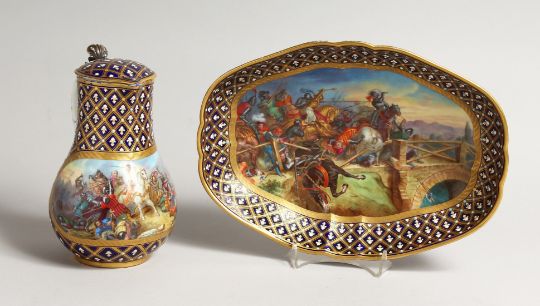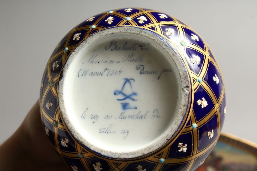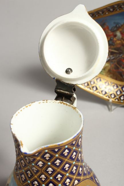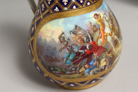 A SUPERB SEVRES PORCELAIN EWER AND OVAL DISH, blue ground painted with a battle scene, BAYARD 1503,
