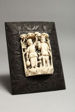 A GOOD CARVED AND PIERCED EUROPEAN IVORY OF A MAN AND A WOMAN IN AN ARBOUR.