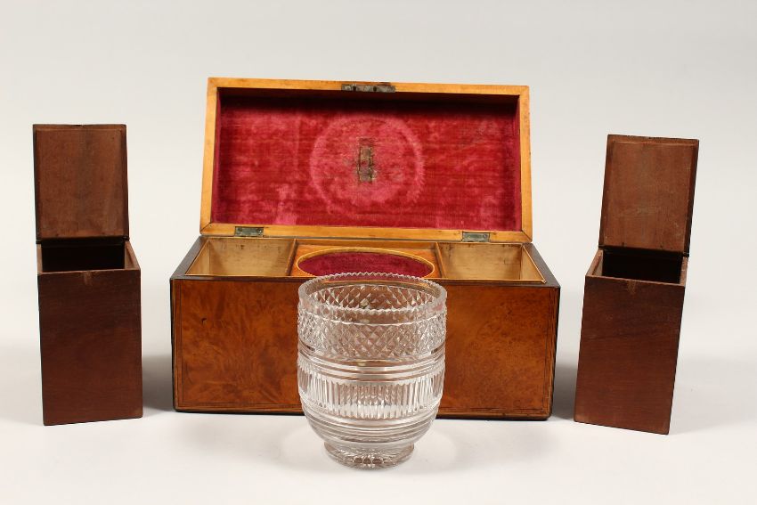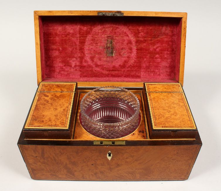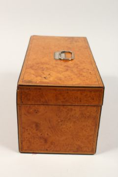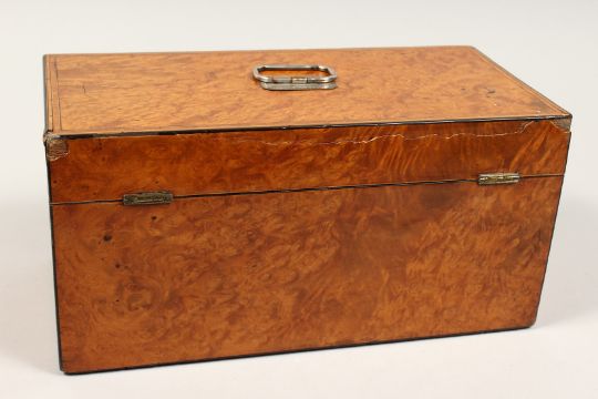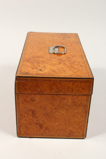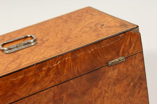 A LARGE GEORGE III POLLALRD SATINWOOD TWO DIVISION TEA CADDY, banded top. silver plate handle.
