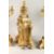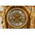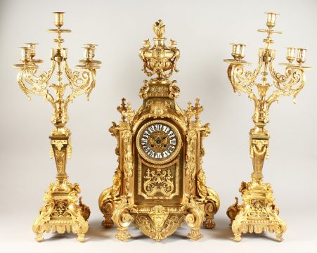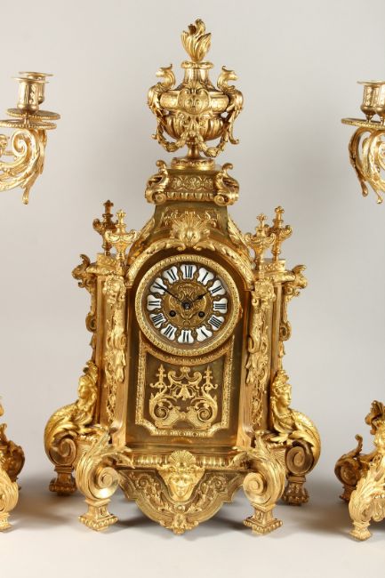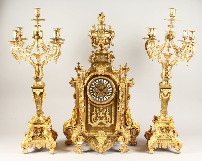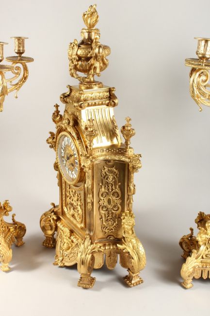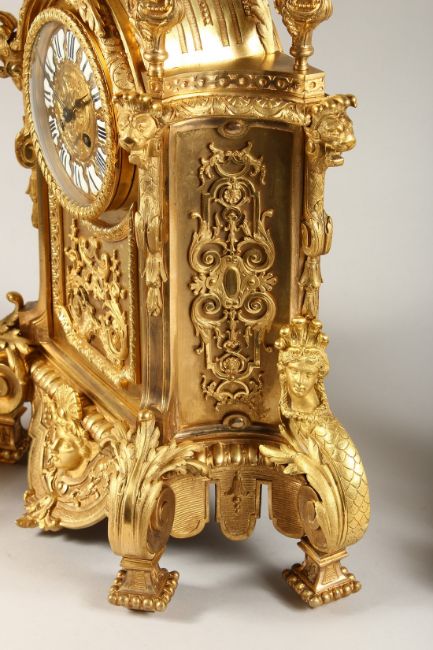 A LARGE FRENCH ORMOLU THREE PIECE CLOCK GARNITURE, the clock with urn finial, garlands, lion masks etc., with circular dial with black and white Roman numerals.