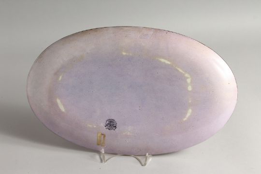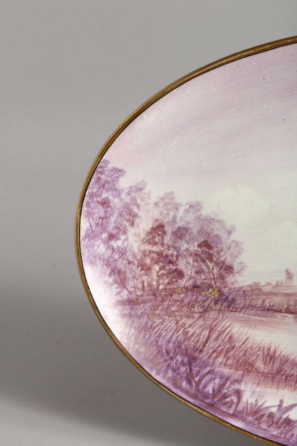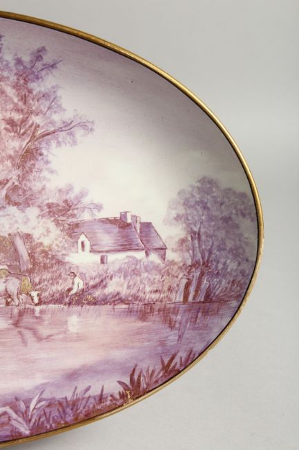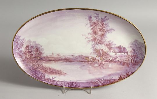 A PORCELAIN OVAL PLAQUE, painted with cattle and a man by a pond.