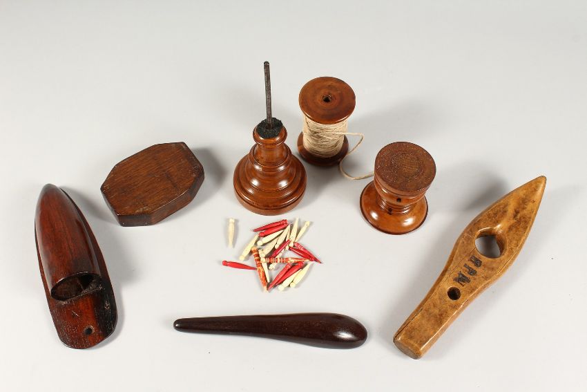 SIX VARIOUS ITEMS OF TREEN including a shuttlecock