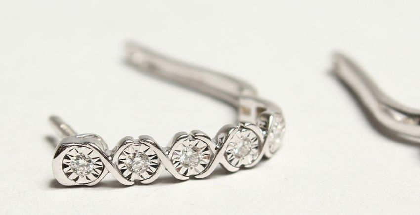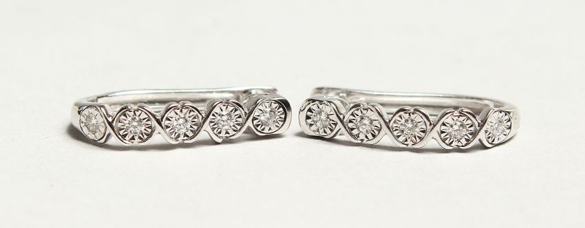 A PAIR OF 18CT WHITE GOLD AND DIAMOND HOOP EARRINGS.