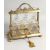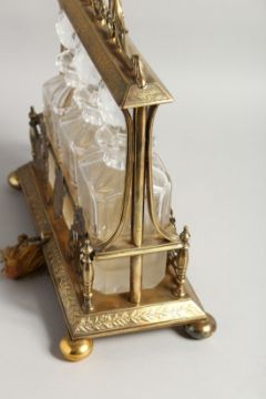 A VERY GOOD VICTORIAN, GILDED PLATE, THREE BOTTLE TANTALUS with acanthus scrolled handles, engraved foliage on four bun feet.