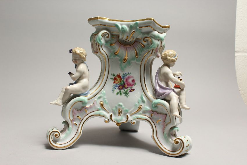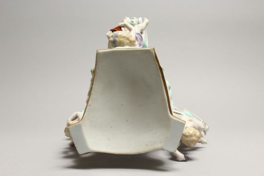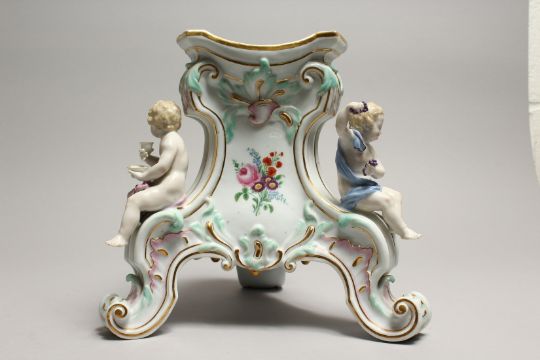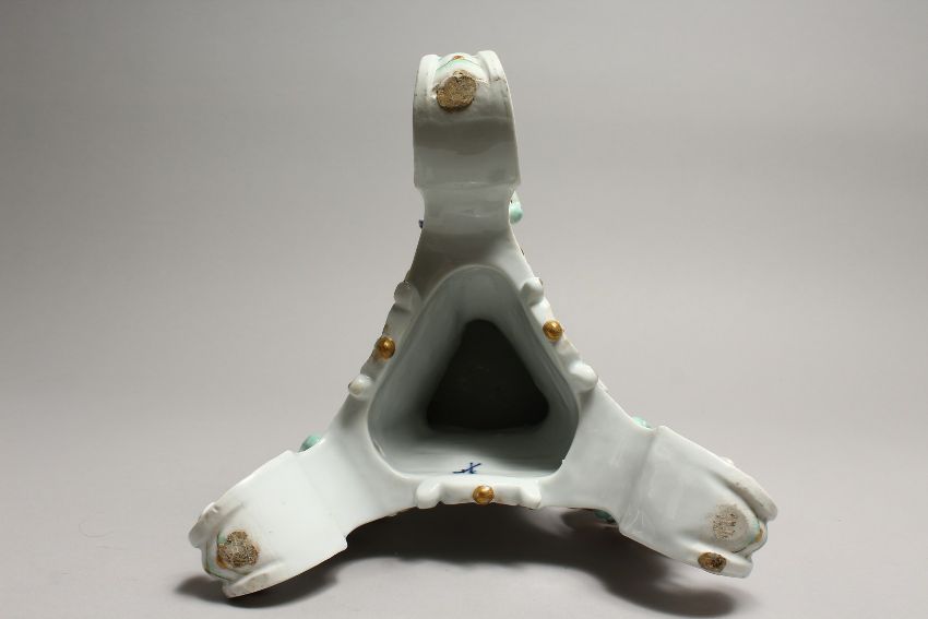 A 19TH CENTURY MEISSEN PORCELAIN STAND edged in gilt and mounted with three cupids.