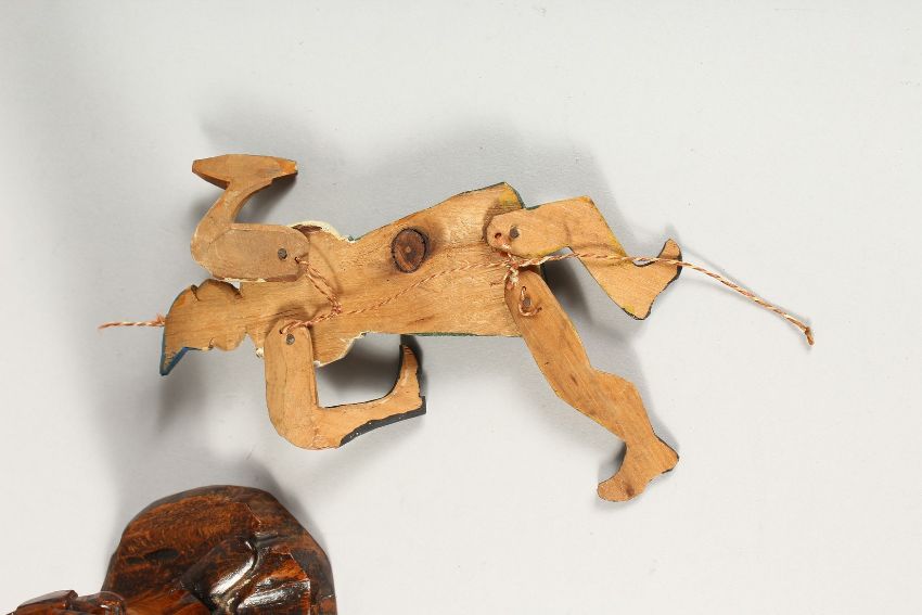 A CARVED TREEN FIGURAL PIPE and stand, 8.5ins high, and a puppet (2)