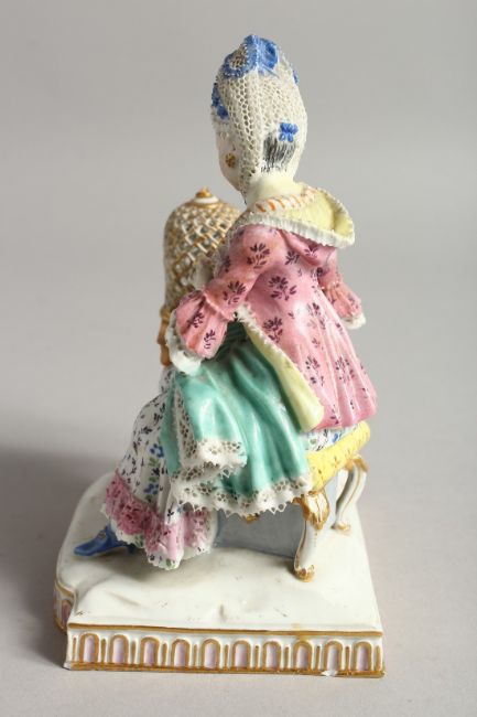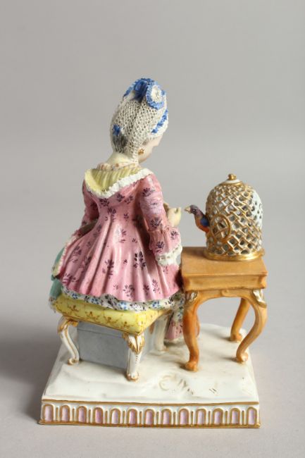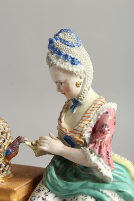 A 19TH CENTURY MEISSEN PORCELAIN GROUP, a seated lady with a bird in a cage.