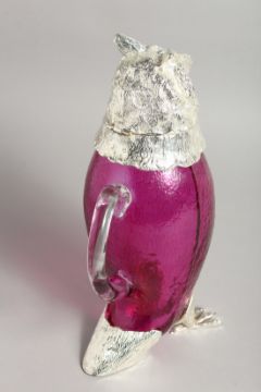 A LARGE PLATED CRANBERRY OWL CLARET JUG with glass eyes