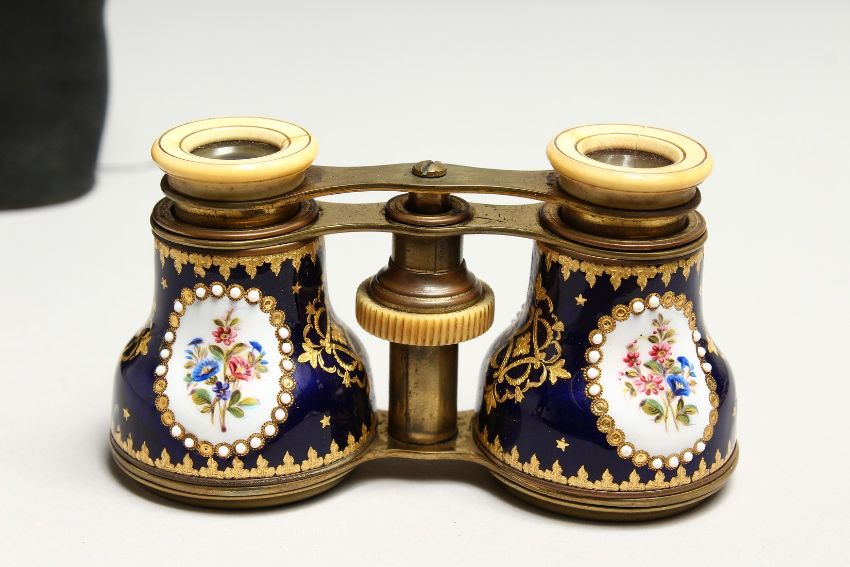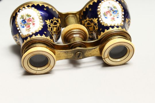 A VERY GOOD SET OF ENAMEL AND IVORY OPERA GLASSES, rich blue ground painted with flowers, in leather case.