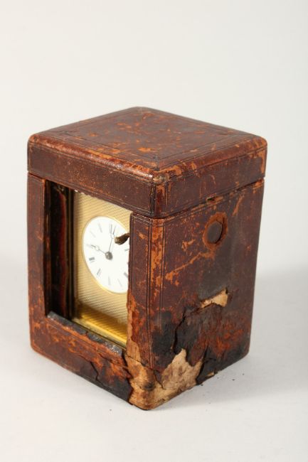 A GOOD 19TH CENTURY FRENCH BRASS REPEATER CARRIAGE CLOCK with engine turned face, black and white dial, movement no. 1995, in an engraved case and leather carrying case
