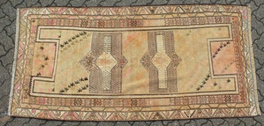 AN UNUSUAL KHOTAN (CAUCASIAN) CARPET, beige ground, two central lozenge shaped medallions with stylised motifs.