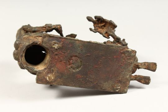 AN UNUSUAL"BENIN" BRONZE GROUP DEPICTING TWO FIGURES FACING ONE ANOTHER, one a blacksmith, the other holding a turtle and a dish.