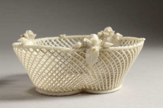 A BELLEEK PORCELAIN TREFOIL SHAPED PIERCED BASKET
