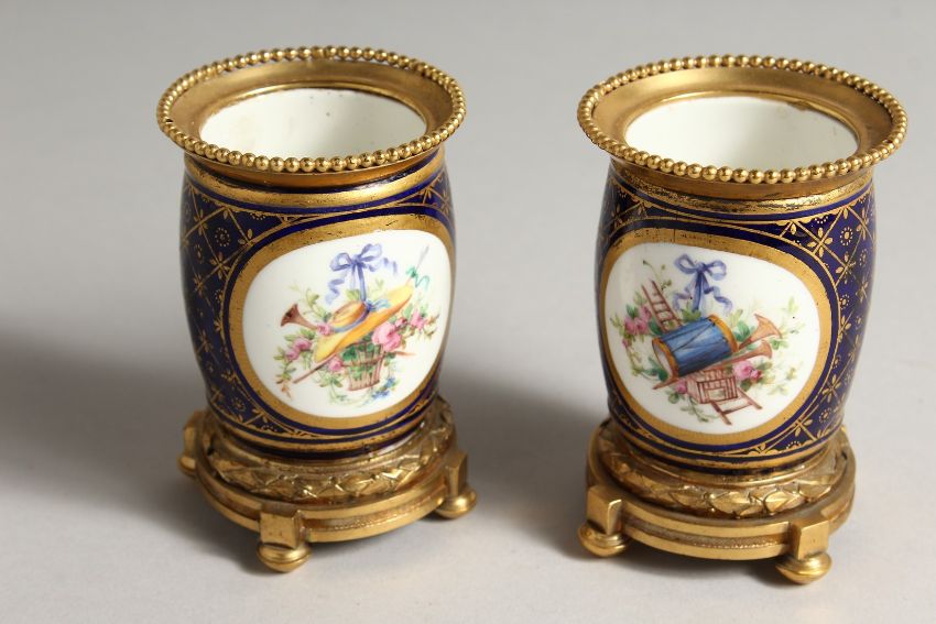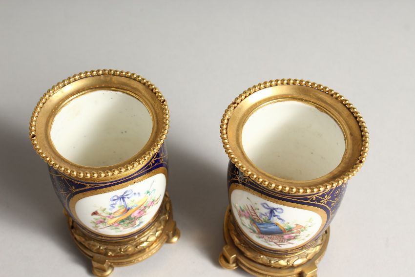 A SUPERB SMALL PAIR OF SEVRES PORCEALIN ORMULO MOUNTED VASES, painted with reverse panels of musical trophies and children/