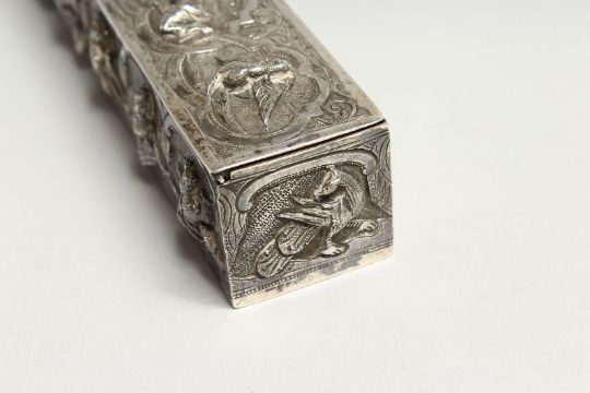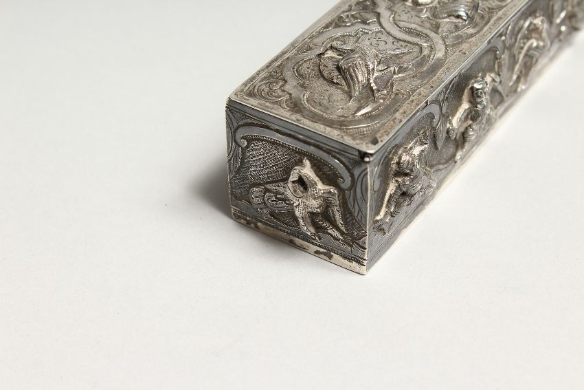 A BURMESE SILVER LONG BOX AND COVER with figures in relief