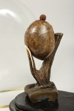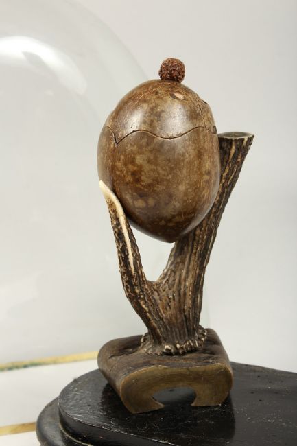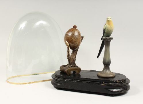 A VICTORIAN BIRD ON A PERCH AND COCONUT ON A STAG HORN, under glass dome.