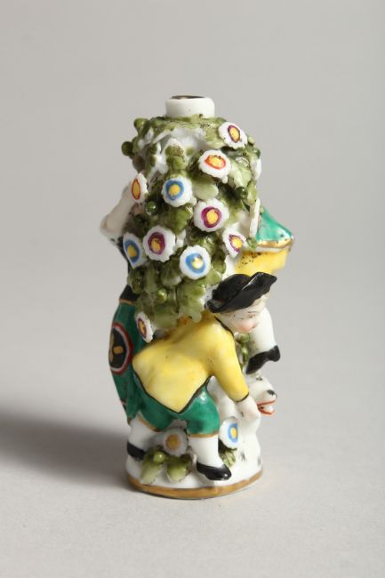 A SMALL SAMSON OF PARIS PORCELAIN SCENT BOTTLE, figures on a flower encrusted tree with dog,