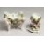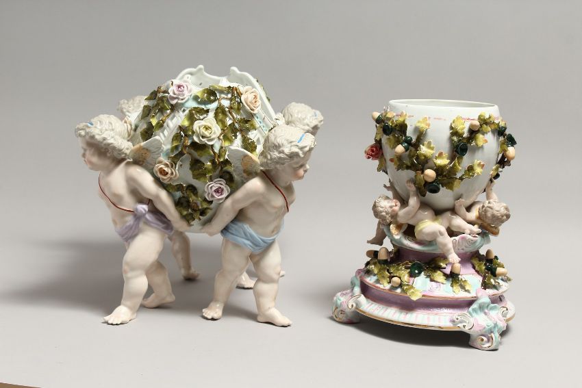 A LARGE FLORAL ENCRUSTED PIERCED PORCELAIN CENTREPIECE of a basket form, being supported by four winged cherubs, together with a similar centrepiece (A F).