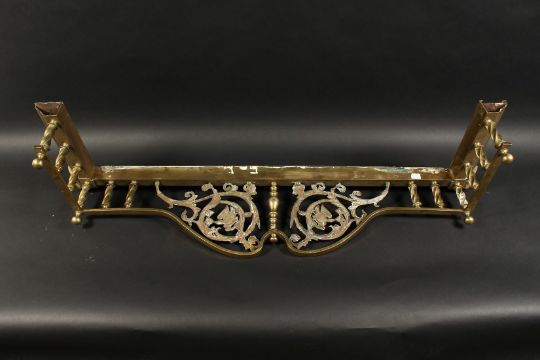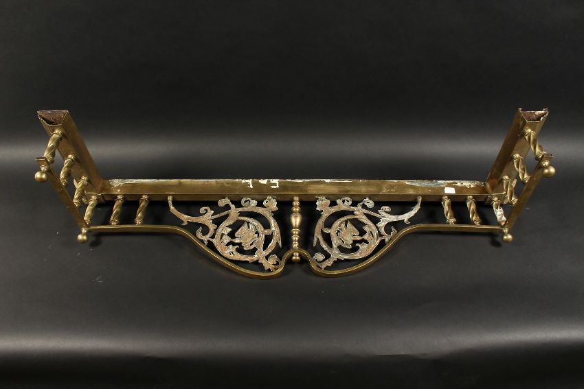 A VERY GOOD 19TH CENTURY BRASS FENDER, pierced front with acanthus, fruiting vines and birds