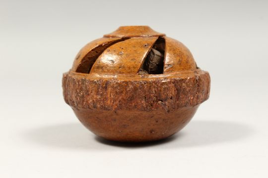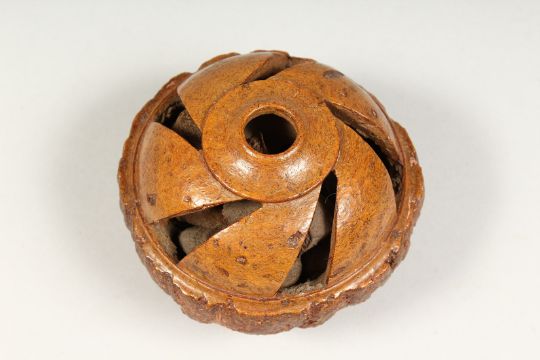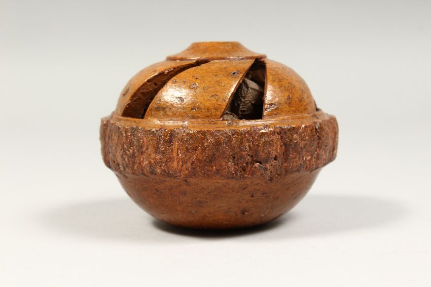 A TREEN BRAZIL NUT, carved and pierced, Desborough Collection.
