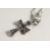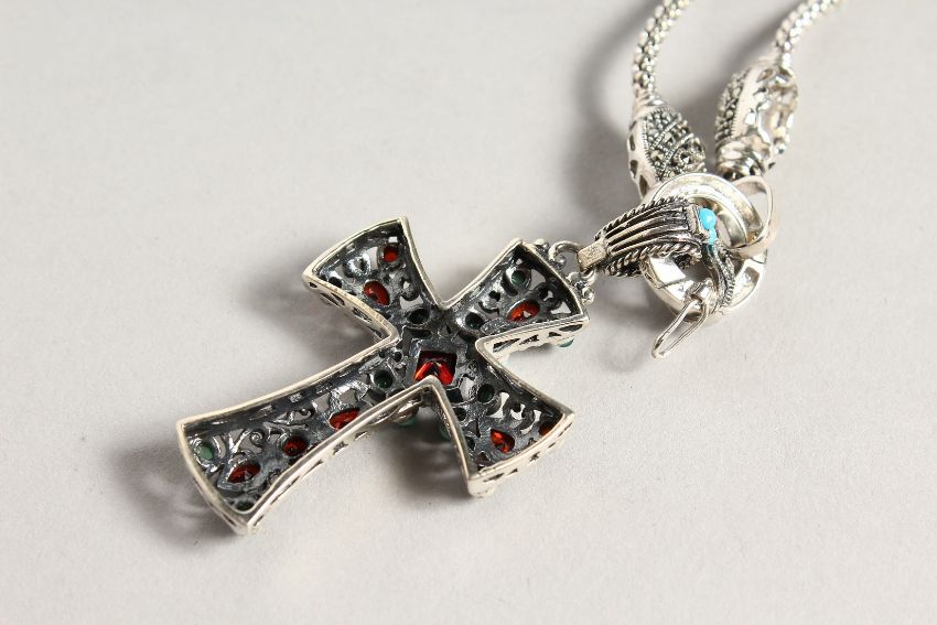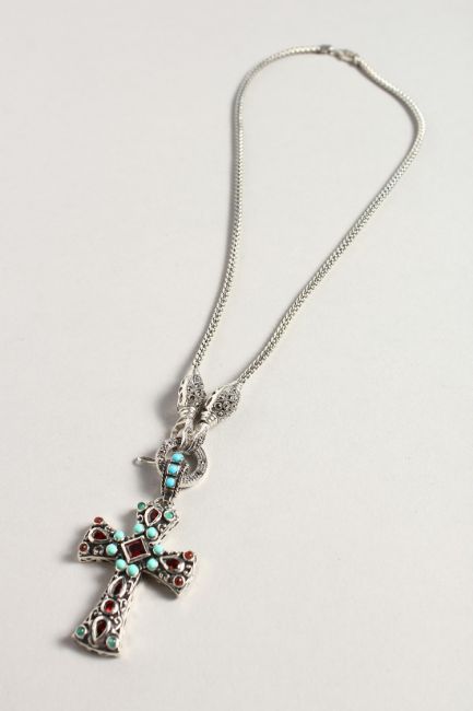 A SILVER TURQUOISE AND GARNET CROSS on a silver chain.
