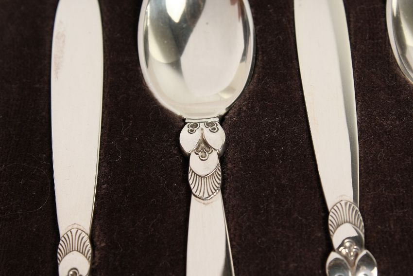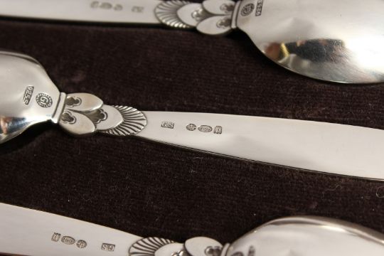 A GOOD SET OF 6 GEORG JENSEN CACTUS PATTERN SILVER CASED COFFEE SPOONS