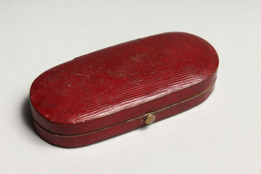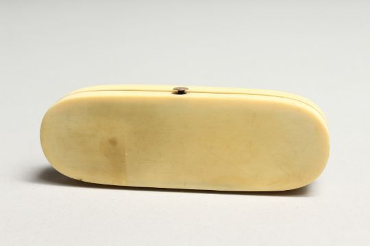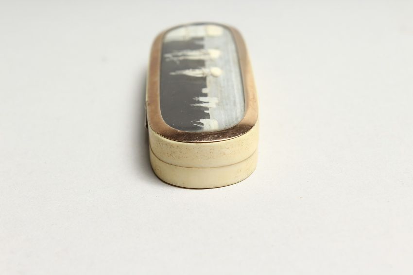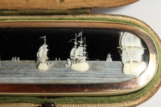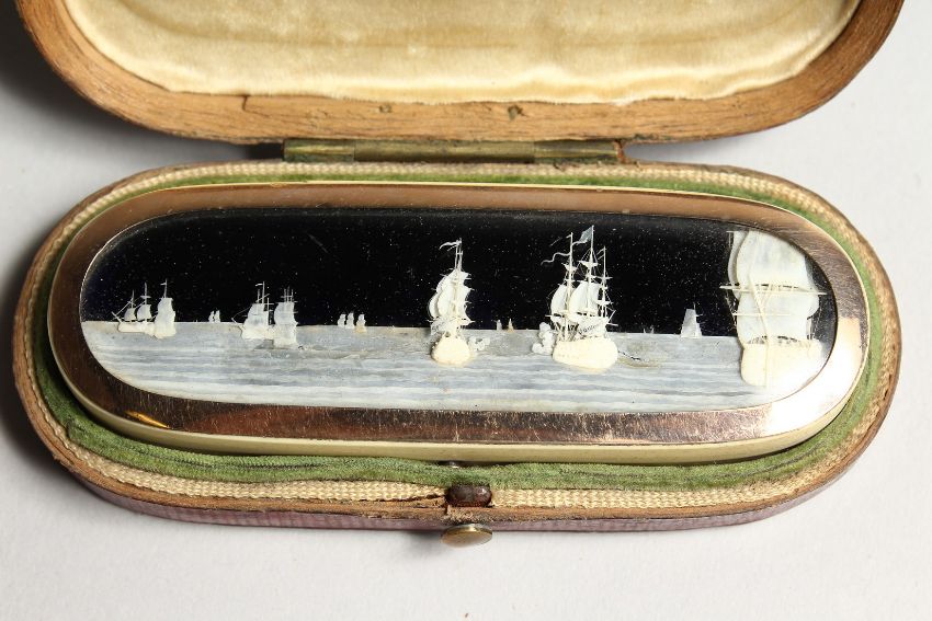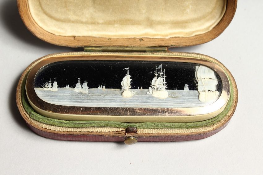 A STEPHANY AND DRESCH MICRO IVORY CARVING, GOLD MOUNTED IVORY TOOTHPICK BOX in a folding leather case depicting The French man of war SPARTIATE and NELSON’S SHIP, VANGUARD. and another man of war- depicting The Mediterranean Campaign of 1778.