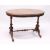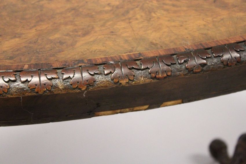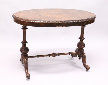 A VICTOTIAN FIGURED WALNUT OVAL STRETCHER TABLE with quartered top carved edges on turned legs with porcelain castors.