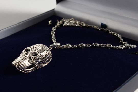 A SILVER SKULL ON A CHAIN.