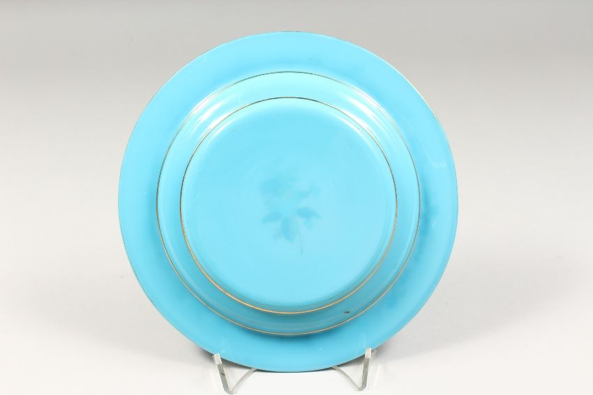 A VICTORIAN BLUE GLASS CIRCULAR OPALINE CIRCULAR PLATE, painted with flowers