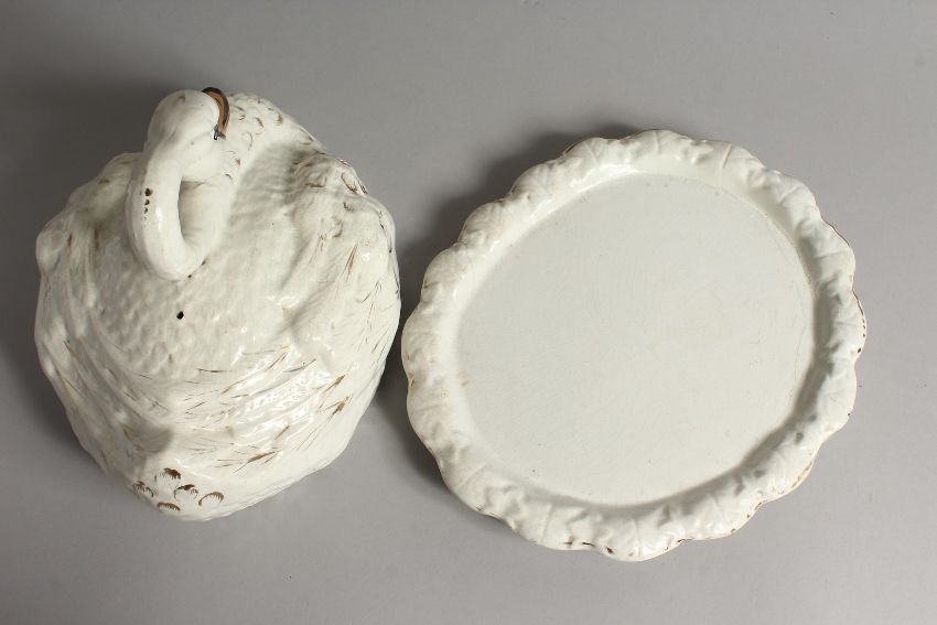 A STAFFORDSHIRE POTTERY CHEESE DISH AND COVER MODELLED AS A SWAN.