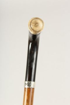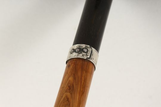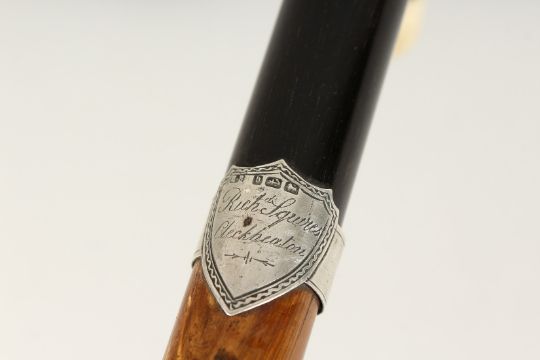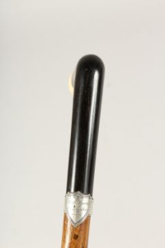 AN EBONY AND IVORY HANDLE WALKING STICK with silver band, Rick Squires