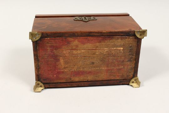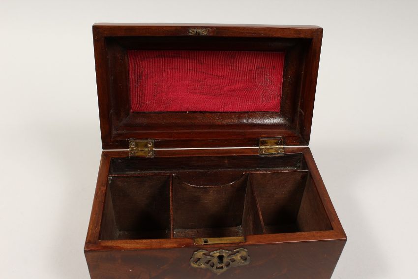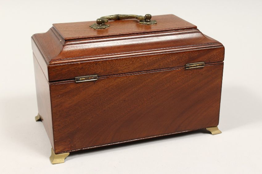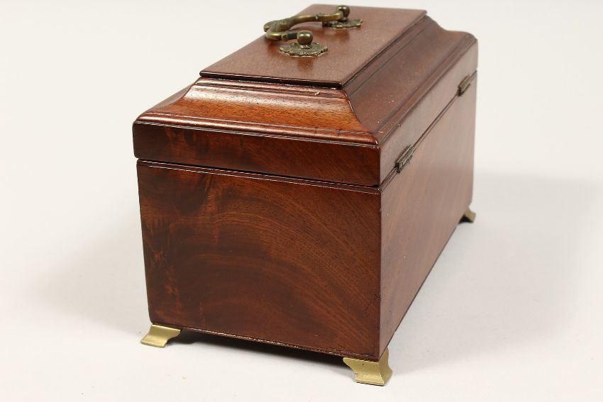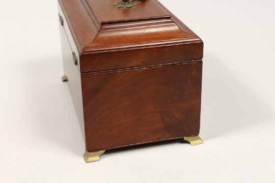 A GEORGE III MAHOGANY THREE DIVISION TEA CADDY with beaded top, brass carrying handles and escutcheon.