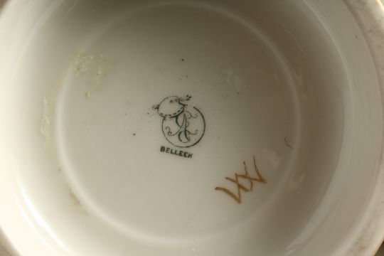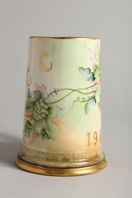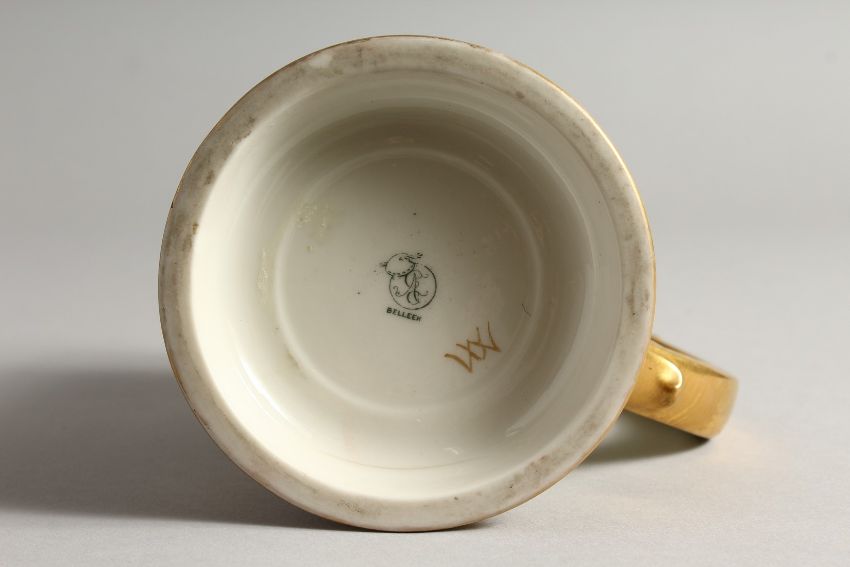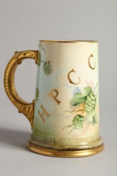 A BEELEEK PORCELAIN TANKARD H. P. C. C. decorated with hops