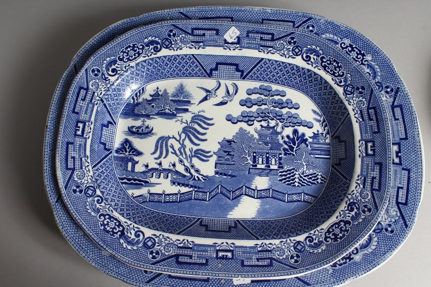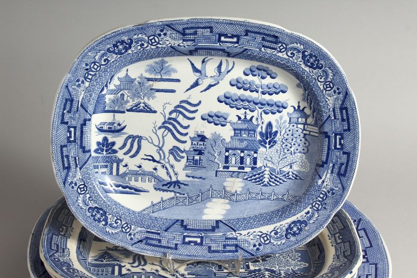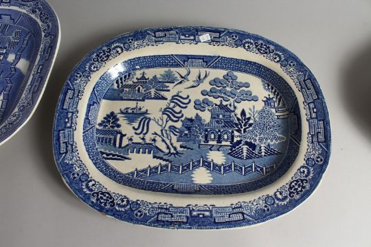 FIVE WILLOW PATTERN OVAL MEAT PLATES