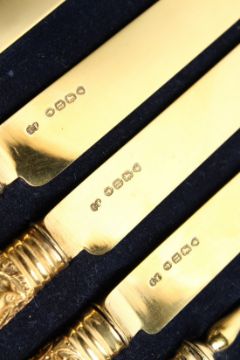 A GOOD SET OF SIX SILVER GILT DESSERT KNIVES AND FORKS, the handles cast with Indian animals and figures
