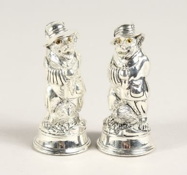 A PAIR OF SILVER PLATE FOX SALT AND PEPPERS