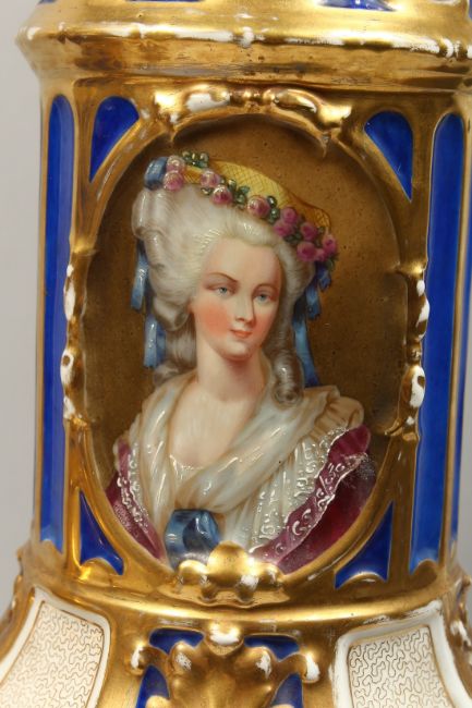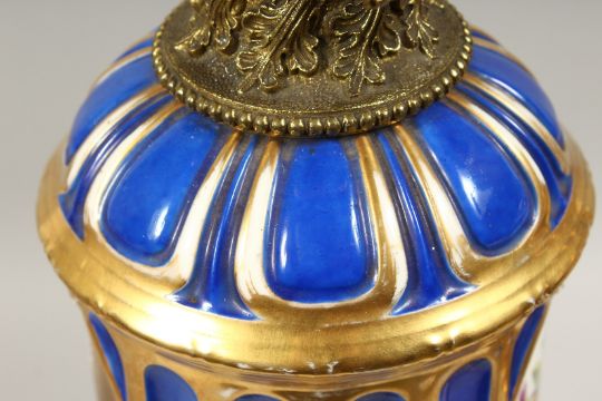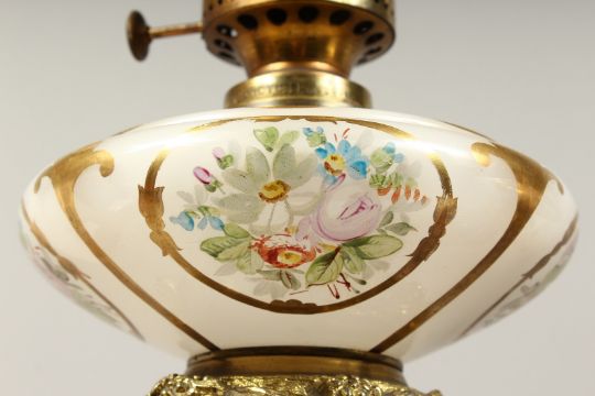 A SUPERB PAIR OF 19TH CENTURY FRENCH PORCELAIN AND GILT BRONZE LAMPS ON STANDS, painted with panels of flowers and reverse panels of portraits.