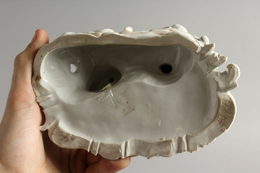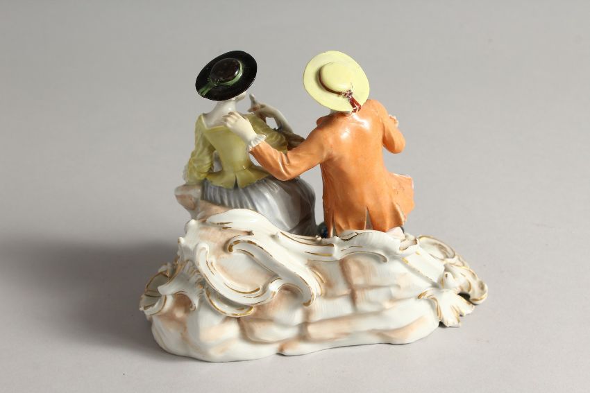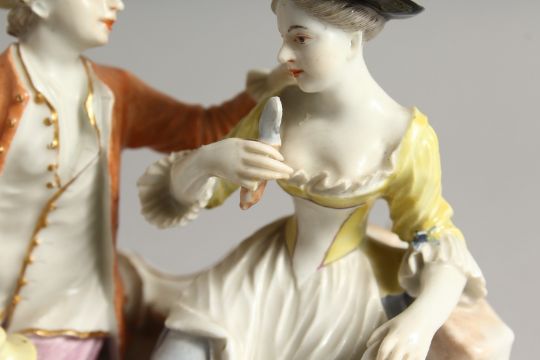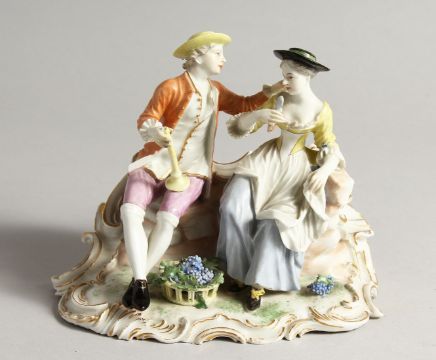 A GOOD FUSTENBURG PORCELAIN GROUP OF A YOUNG MAN AND GIRL ON A BENCH, fruiting vines in a basket