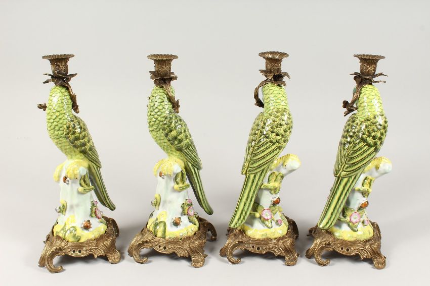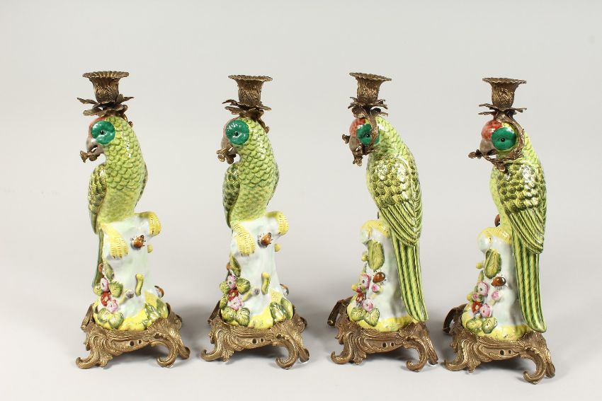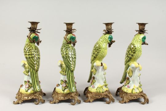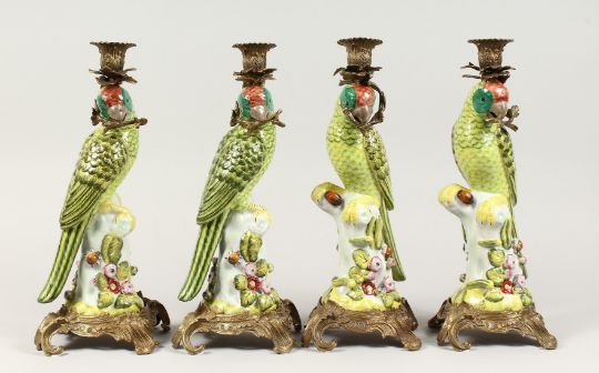 A SET OF FOUR CONTINENTAL PORCELAIN PARROT CANDLESTICKS with gilt bases