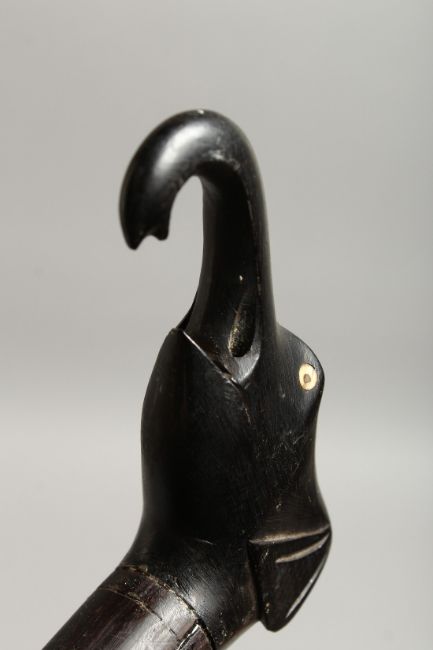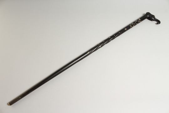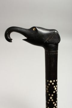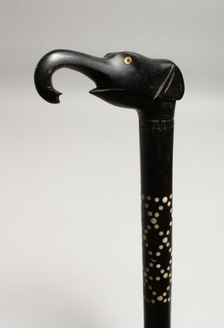 AN INLAID EBONY WALKING STICK, the handle as an elephant’s head
