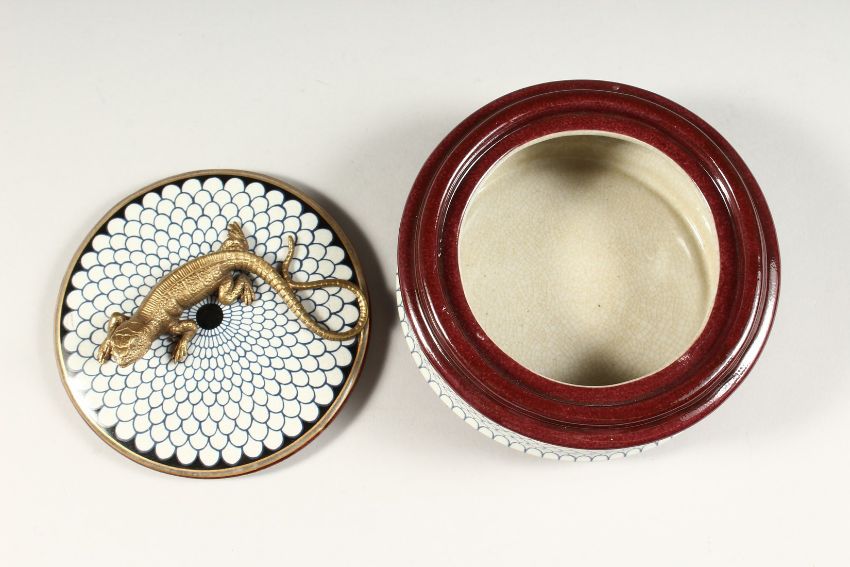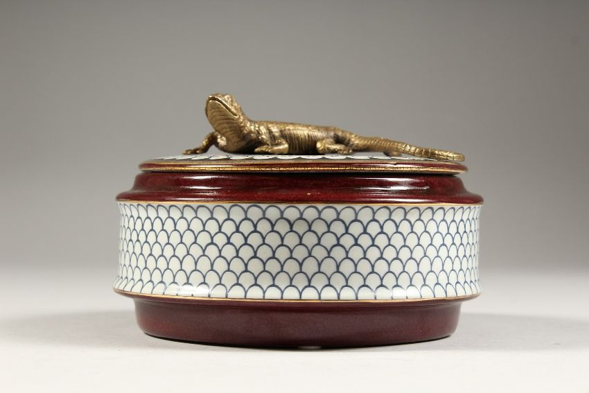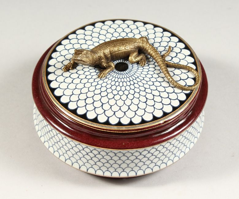 A CONTINENTAL PORCELAIN CIRCULAR BOX AND COVER, the top with a lizard.