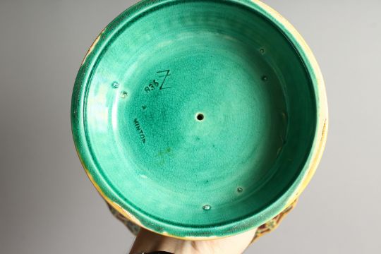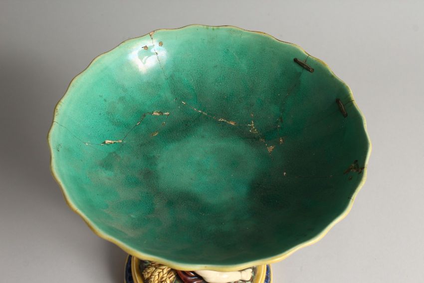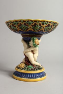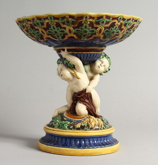A MINTON MAJOLICA COMPORT, modelled as a pair of cherubs holding aloft a bowl. (AF)