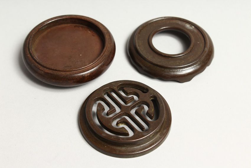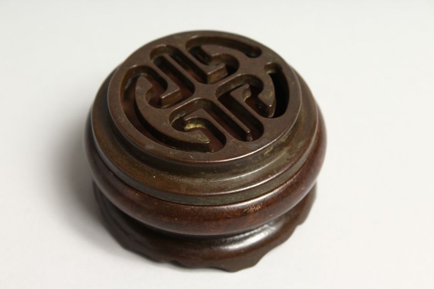 A CARVED CIRCULAR BRONZE PIERCED CENSER on a stand.