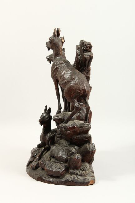 A GOOD 19TH CENTURY BLACK FOREST CARVED GROUP OF THREE DEER on a rocky base.
