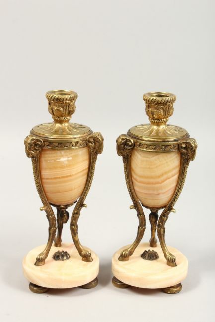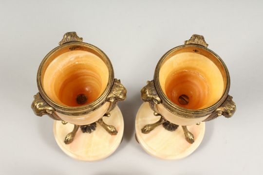 A GOOD PAIR OF 19TH CENTURY FRENCH MARBLE CASSOLETS with ormolu mounts and hoof feet.