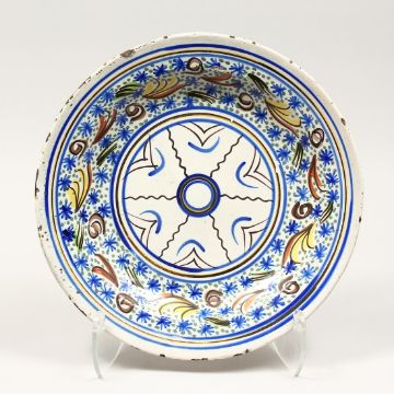 A MAJOLICA BLUE AND CREAM TIN GLAZED CIRCULAR DISH, 13ins diameter.