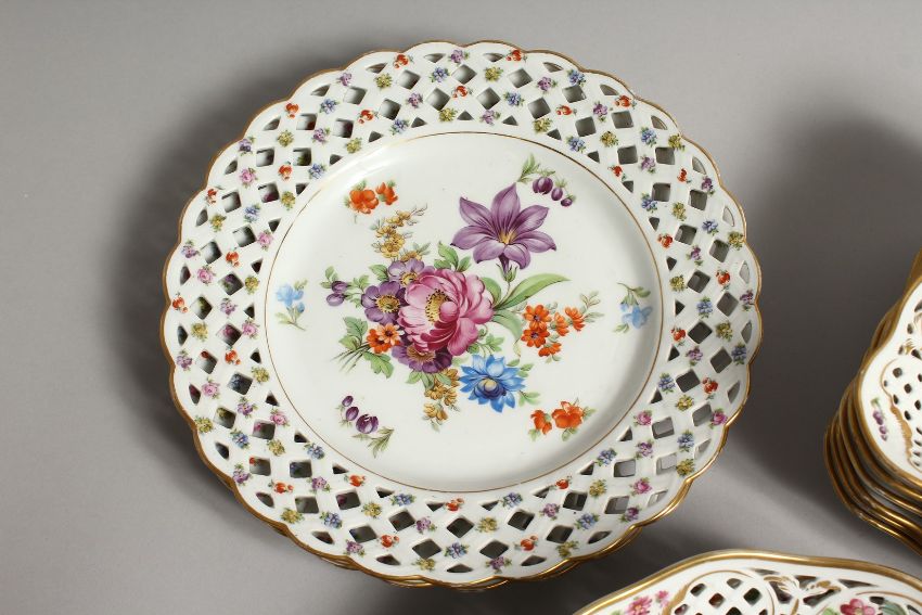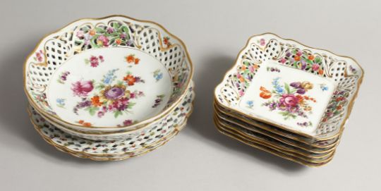 A CONTINENTAL PORCELAIN PIERCED DESSERT SET painted with flowers comprising circular dishes, 9ins diameter, pair of plates 9.5ins diameter, six square dishes 7ins diameter (10).